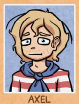 Axel has white skin, blue eyes, and messy blonde hair (making him an aryan). he has facial hair, which is stubble.