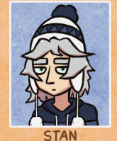 Stan has white skin, green eyes, and white hair, and wears a hat